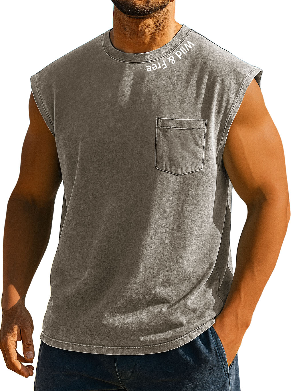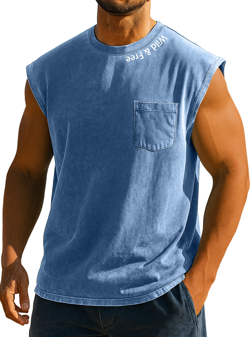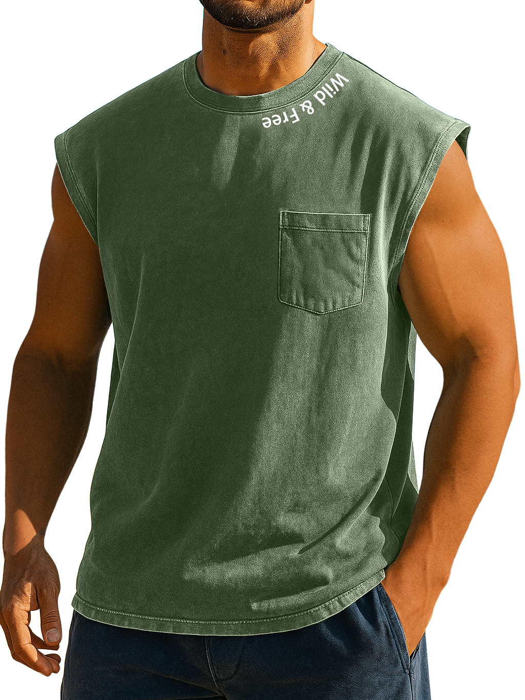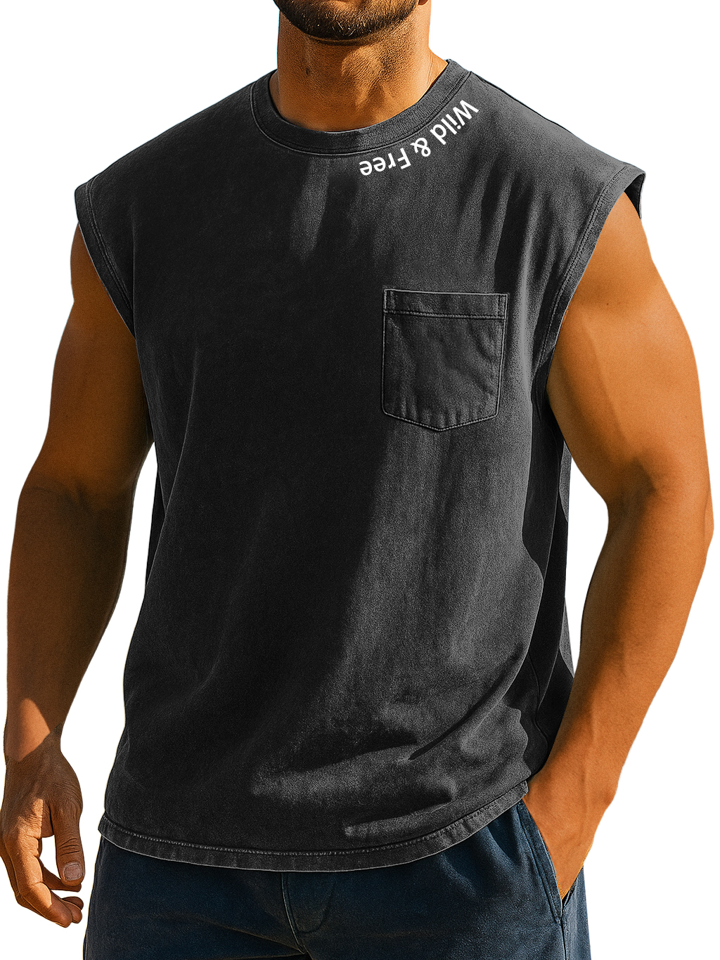 Men's Stylish Retro Distressed Pocket Wild And Liberty Print Sleeveless Top
