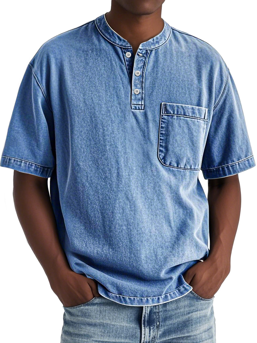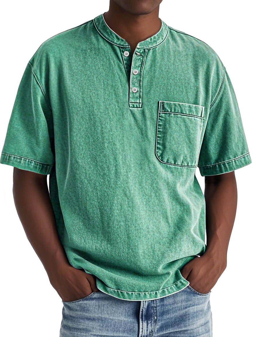 Men's Vintage Distressed Stand Collar Pocket Casual Short Sleeve Henley Shirt