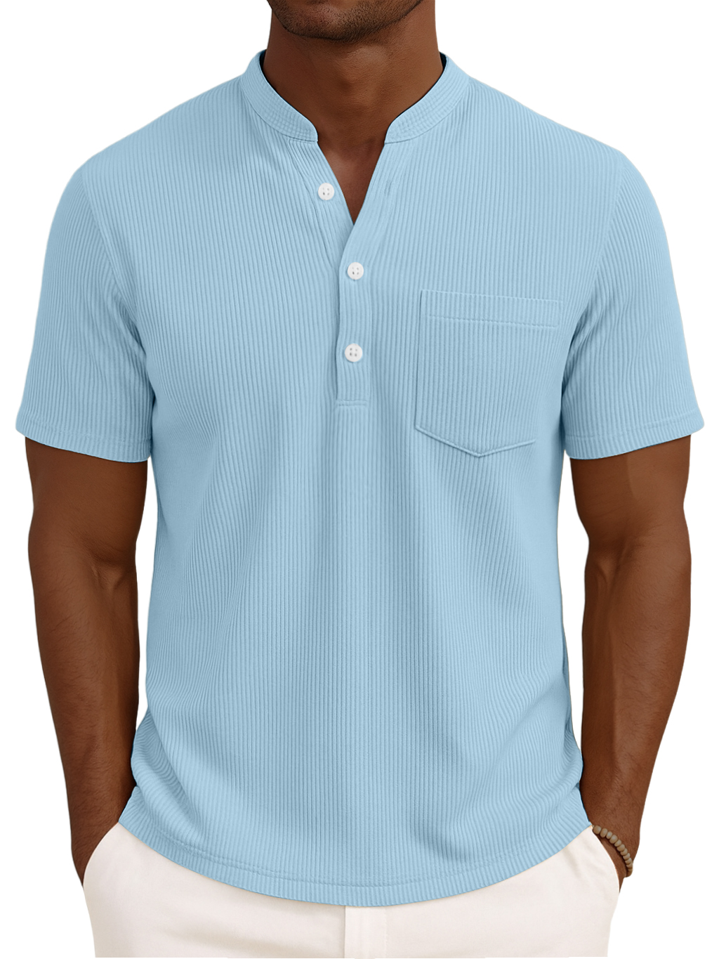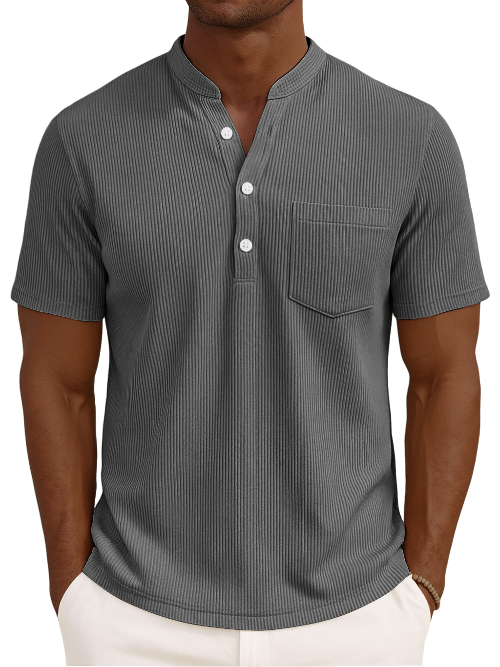 Men's Henley Collar Solid Color Loose And Comfortable Vertical Striped Pocket Short-sleeved Top