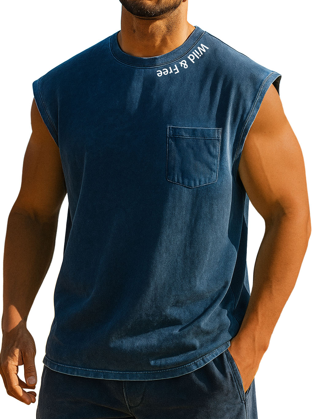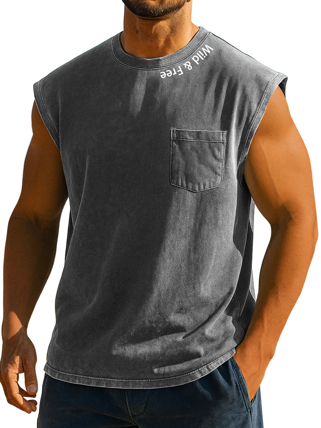 Men's Retro Cotton Washed Pocket Round Neck Sleeveless T-shirt